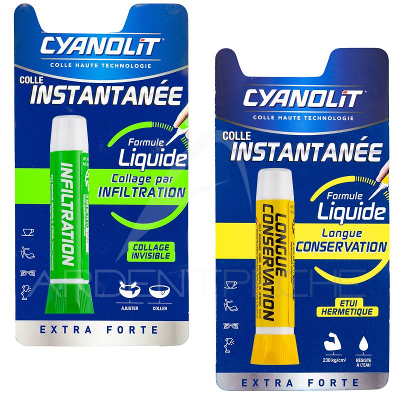 Colle Cyanolite extra-forte pour tout coller. La Cyanolit verte a une prise instantanée, la Cyanolit jaune a une prise retardée d'environ 20 secondes.