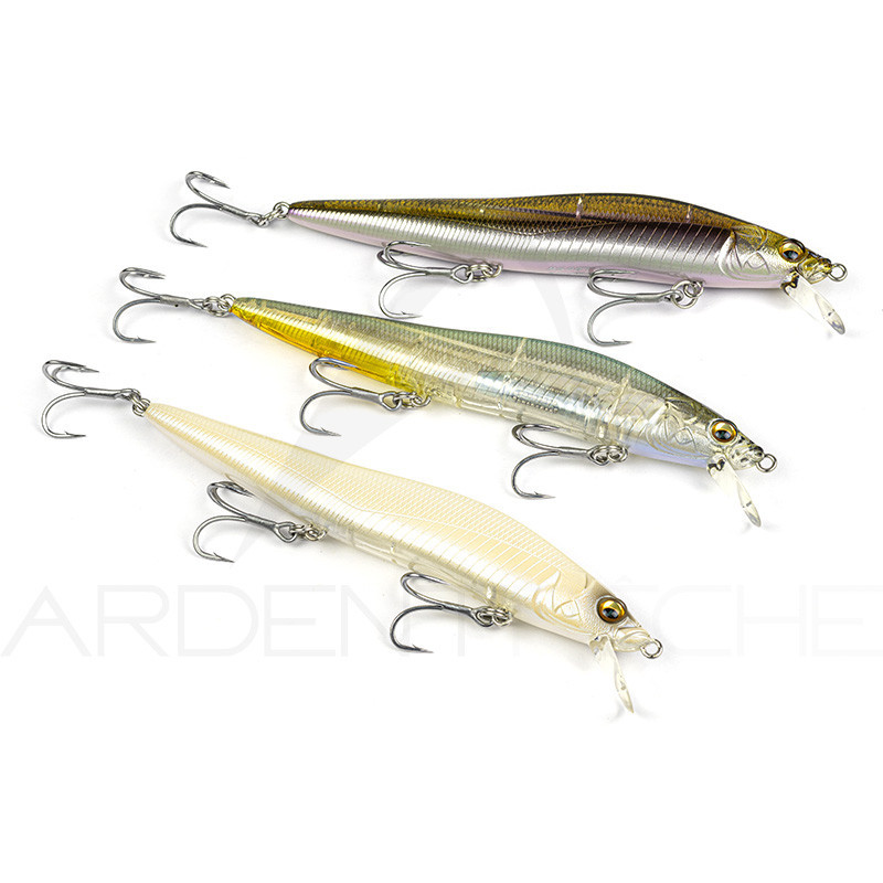 Le célèbre Vision Oneten dispose dans cette version du système LBO II de transfert de masse sur roulements à billes qui lui permet d´atteindre des distances de lancers plus importantes que la version classique. Nous le conseillons en particulier aux pêcheurs qui opèrent depuis la côte et qui doivent parfois aller chercher les poissons loin du bord.Pack de 3 MEGABASS Vision One Ten LBO SW pour la pêche des carnassiers, qu'ils soient marins ou d'eau douce. Le coloris Ghost lançon, LA couleur la plus polyvalente utilisable par tout temps, le coloris Blanc, comme on dit chez nous "le blanc dans le blanc", il est à privilégier lorsque le plafond nuageux est bas, que le temps en gris, et enfin, le coloris ITO wakasagi, plus sombre et complémentaire aux deux autres, il reprend les teintes d'un poisson fourrage.Ce pack comprend les coloris : - Ghost lançon - French pearl - ITO wakasagi